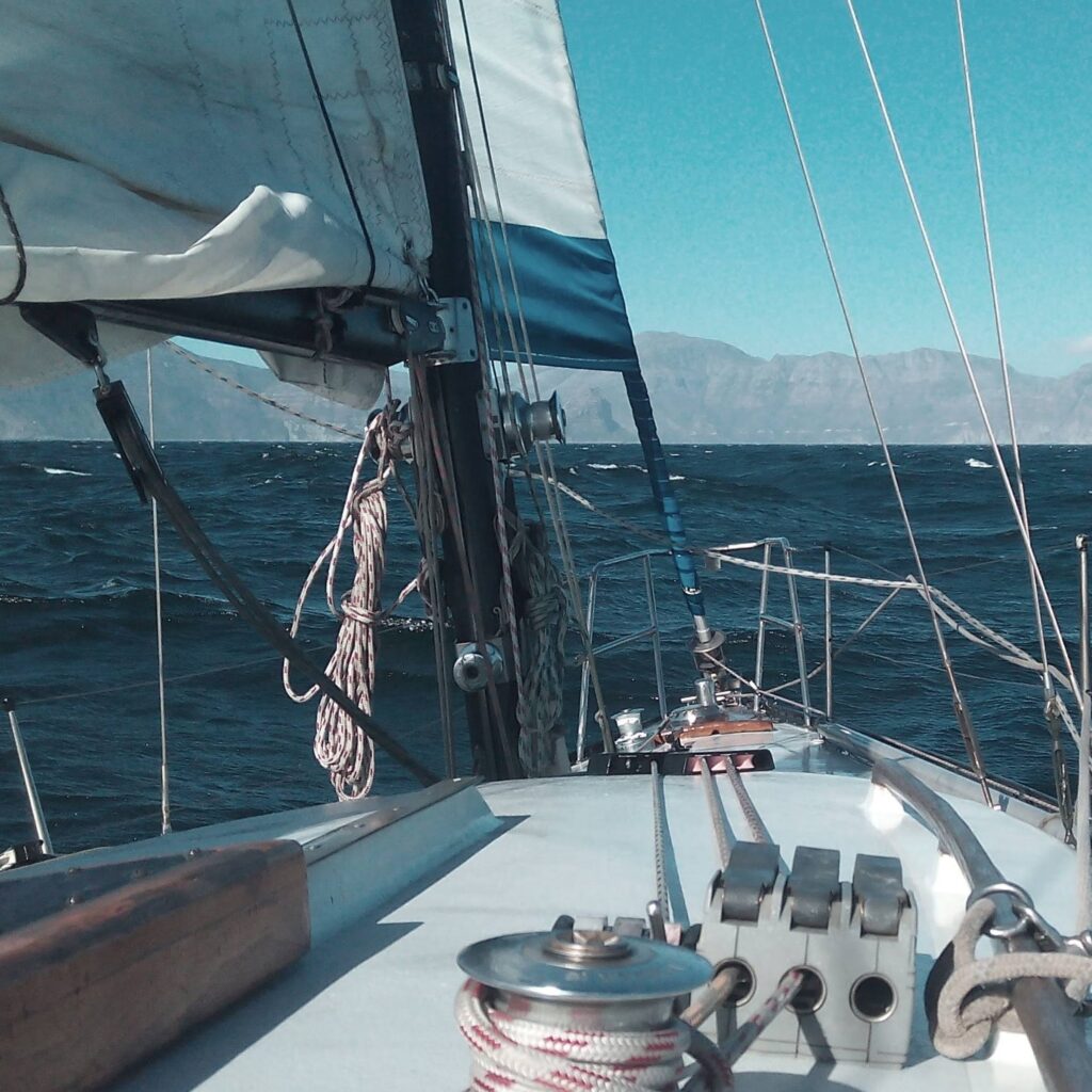 The topography here plays a huge factor in shaping the wind. The wind that chased us, tail-between-legs, from Hout Bay funnels over Llandudno slamming us with 30-35kts once again. But this time it’s on the beam and the ship handles it in her stride. The calmer patches hold wind of 20-25kt and we grin at each other in the “calm” of 25kts. Life really is all about relativity at times. Who would have thought 25kts would be so welcome?